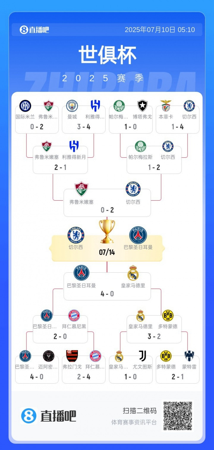 直播吧7月10日讯世俱杯半决赛,巴黎4-0大胜皇马,决赛将战切尔西。